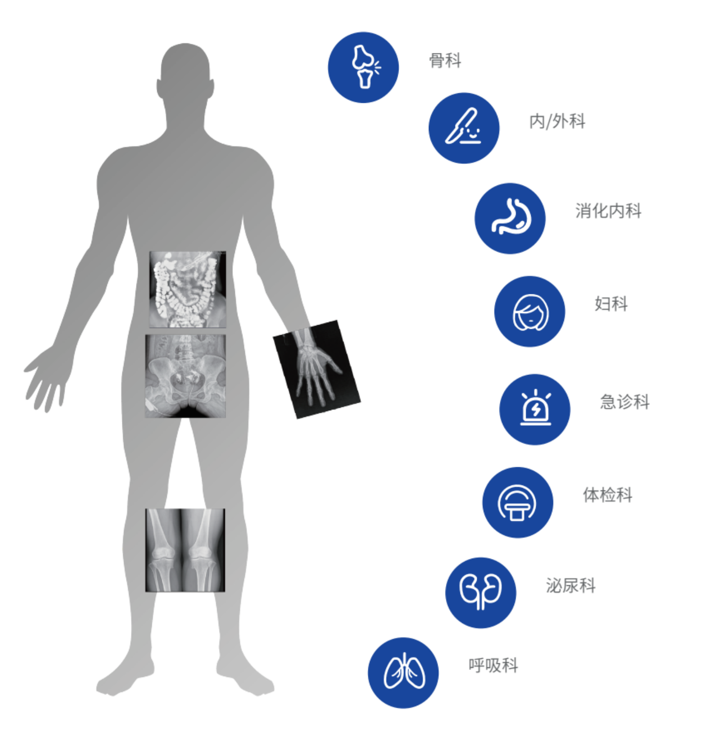 動態(tài)DR集常規(guī)拍片、胃腸、透視、造影于一體,可應用于臨床各科室,如體檢科、內(nèi)科、外科、骨科、急診科等,臨床用途更加廣泛。